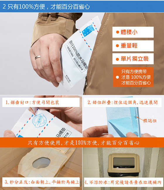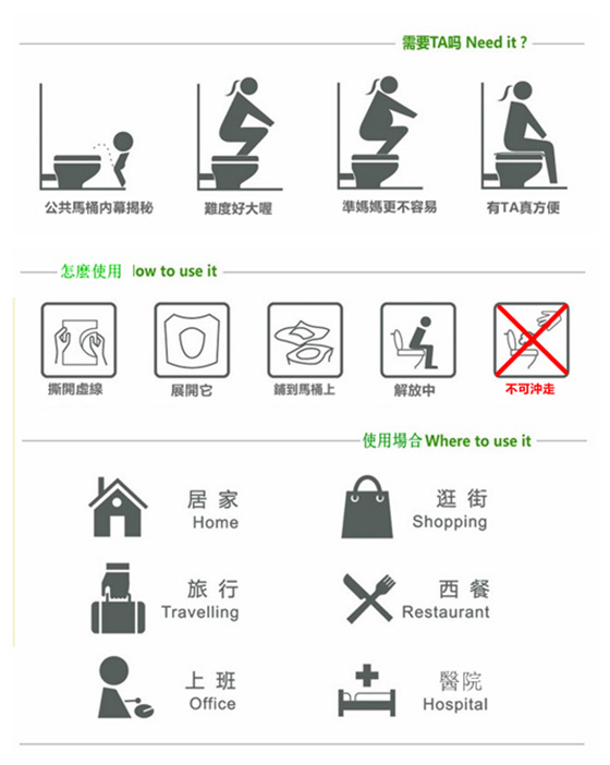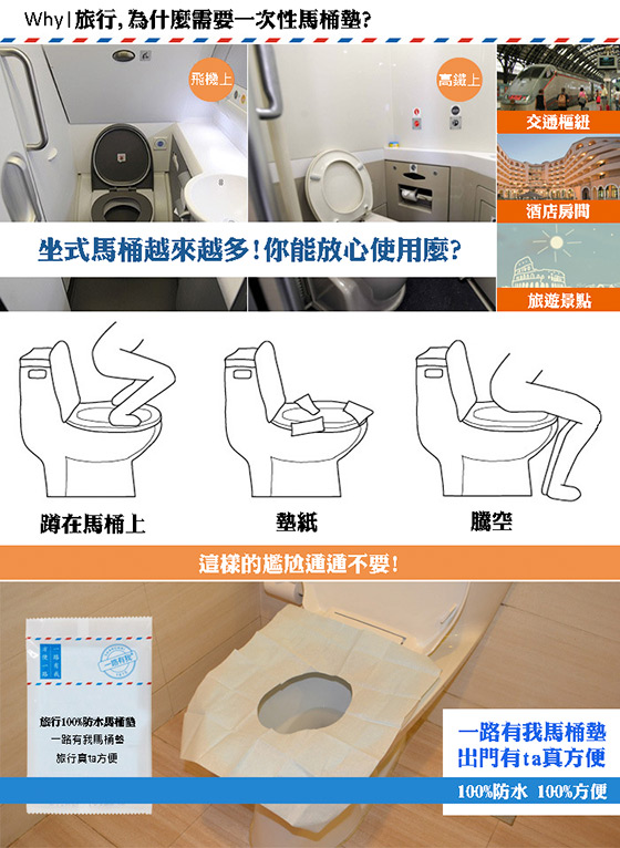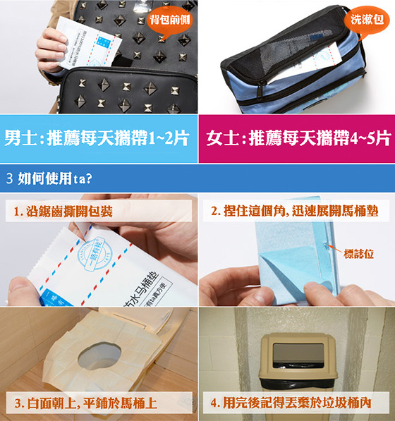 ●拋棄式坐墊,幫助你不用爬高或特技,也能好好上個廁所