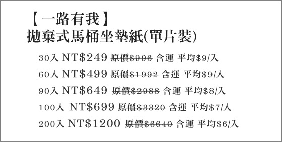 商品簡述: 平均每入最低只要6元起(含運)即可購得【一路有我】拋棄式馬桶坐墊紙(單片裝)30入/60入/90入/100入/200入。
