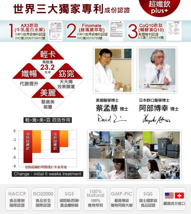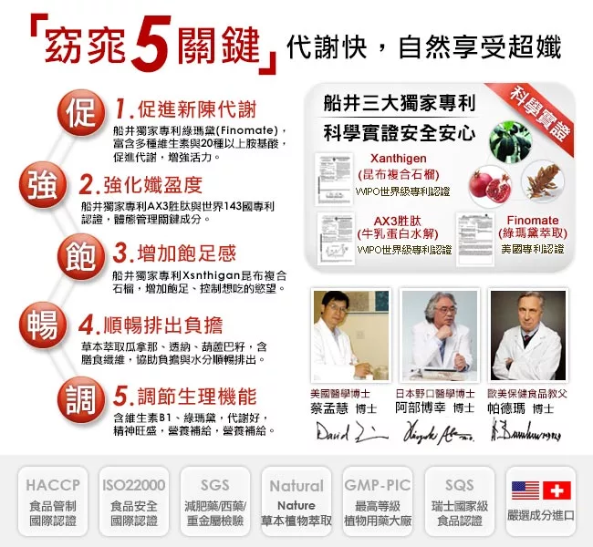 成份:昆布複合石榴(專利Xanthigen享受配方)、葫蘆巴籽、瑪黛茶(專利Finomate 綠瑪黛萃取物)、牛乳蛋白水解物(含AX 3胜?)、瓜拿那、透納、維生素B1。