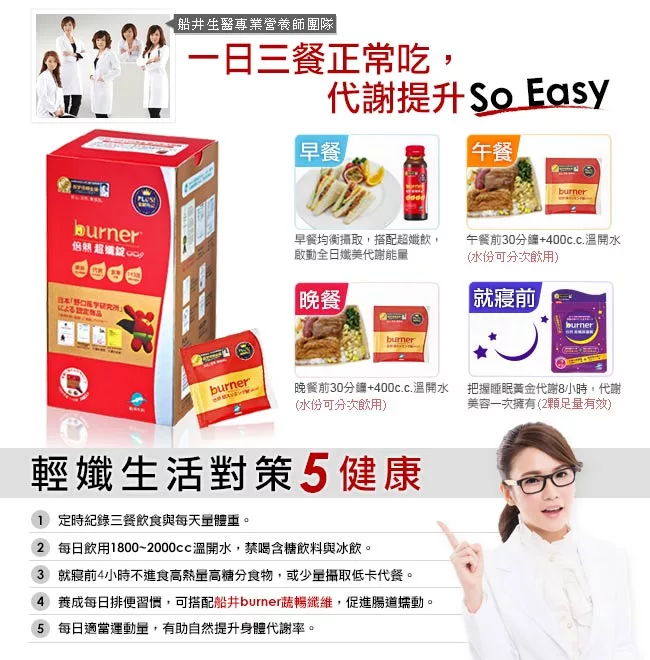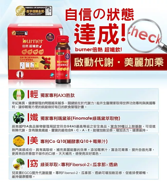 船井生醫研發團隊與日本野口醫學研究所醫學博士團隊共同研發,堅持以「研究實驗」及「科學證據」研發高品質、安全、安心的健康輔助產品。《burner?倍熱? 超孅錠》採用草本植物精焠,取得世界三大獨家專利成分,經歐、美、日各國科學實驗證明,提供給您安心、健康、科學的健康管理輔助產品,值得您深深信賴!