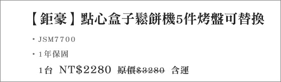 商品簡述: 只要2280元(含運)即可購得【鉅豪】原價3280元點心盒子鬆餅機5件烤盤可替換(JSM7700)1台,購買即享1年保固服務!