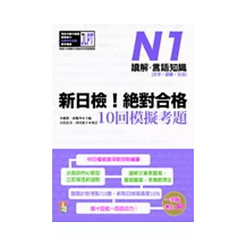 本書根據《日本國際交流基金》所發表的「新日檢相關概要」,並分析舊制歷屆日檢考題之後編寫而成。考點犀利之外,考題由中日資深教授群層層把關,專為應考N1的您量身打造!透過反覆的練習,重新檢視過去的盲點,自我反省並改進才是進步的原動力!寫完一本就像考過10次日檢!第一次應考就是考場老手,豈有不過關的道理!