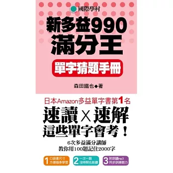只有最積極研究多益考題、總計獲得超過90次滿分的師資團隊,才能做出最精準的猜題,並且持續獲得讀者好評!「新多益990滿分王」系列在日本上市時,就分別摘下Amazon網路書店多益總榜、多益單字、多益閱讀三項冠軍,更罕見地同時登上丸善書店讀者票選年度好書前十名,網友紛紛表示「真的考了!」「考了好幾題一樣的題目」「讓我進步到900多分」。在口耳相傳之下,本系列持續暢銷近三年,至今仍然佔據淳久堂等大型書店TOP 5,全系列累積銷量已突破390,000冊!史上最強多益滿分團隊掀起的隨身學習熱潮,即將風靡全台!