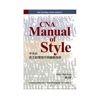 繼「中央通訊社編採手冊」上市掀起熱賣之後,中央社以新思維、新潮流推出英文版的CNA Manual of Style-中央社英文新聞寫作與編輯指南。本書無論對從事英文新聞寫作的新聞從業人員、進修英文的學生、閱讀台灣新聞的外國人士,甚至對需要經常與外籍人士溝通的社會菁英人士,都具有很高的參考價值。